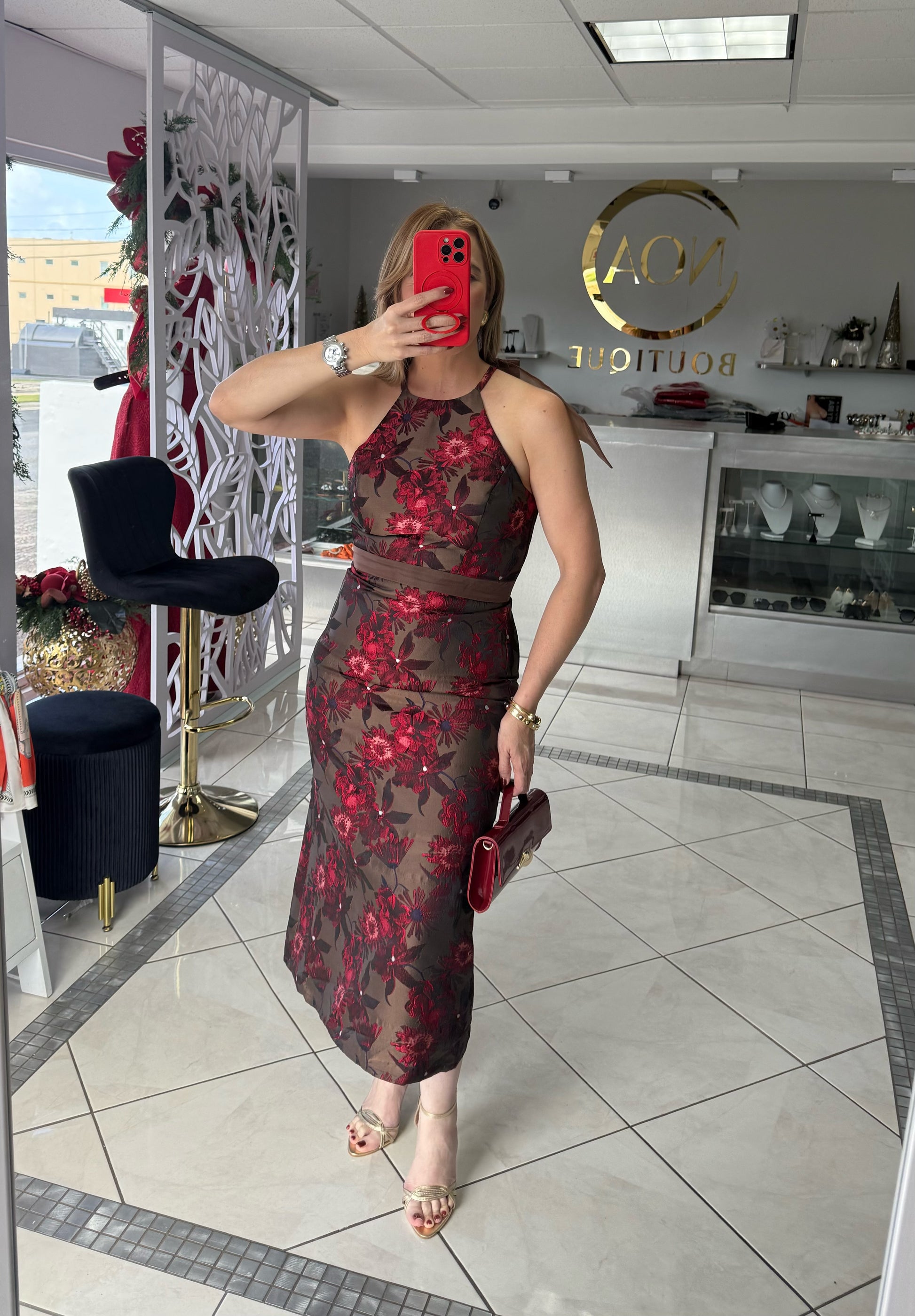 - Traje con estampado floral marron, rojo y burgundy