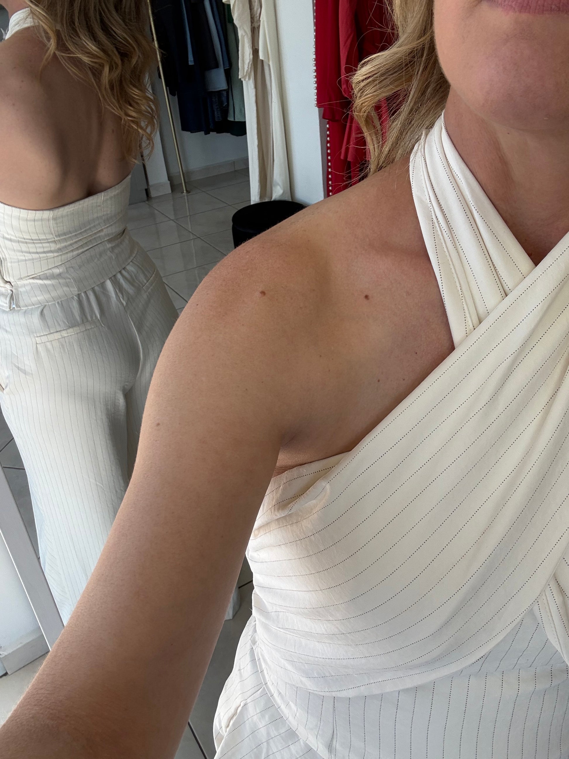 - Top: cierra con zipper en el lado y con clips en el cuello, no estira